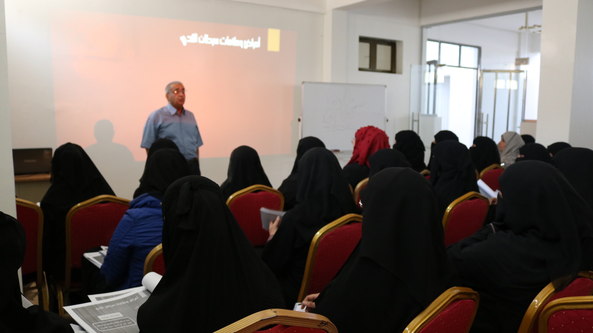 02-03-2020اختتمت الورشة التدريبية الثانية لمشرفات الصحة المدرسية بأمانة العاصمة حول (الأمراض السرطانية وطرق ووسائل الوقاية منها)، والتي استمرت لمدة ثلاثة أيام من 29 فبراير وحتى 2 مارس 2020م، ولعدد (41) مشرفة صحية. وذلك ضمن البرنامج التوعوي الشامل والذي تم فيه استهداف مشرفات الصحة المدرسية بمدارس أمانة العاصمة.